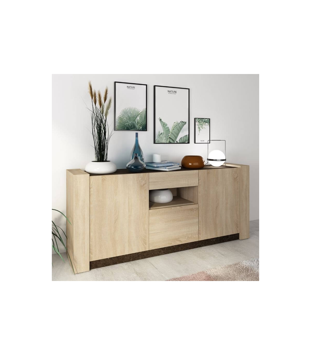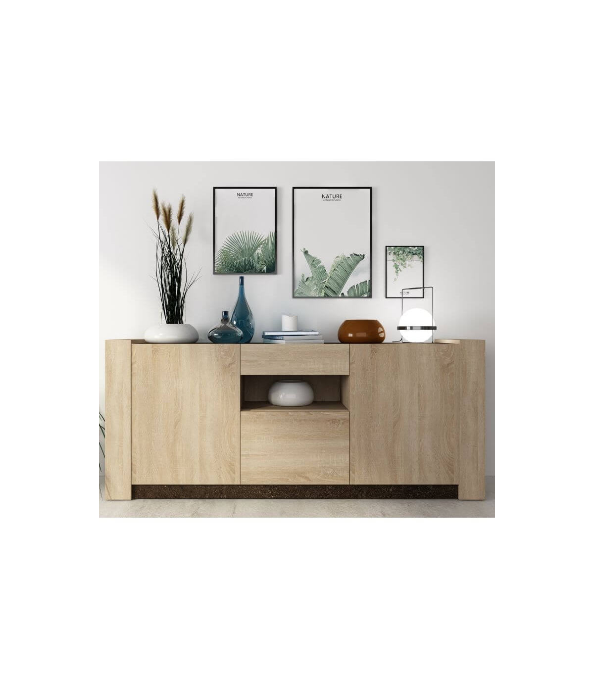 Diseñado para ofrecer máxima organización, dispone de tres puertas, las dos laterales con estantes interiores, un cajón amplio y un hueco abierto con balda, ideal para objetos decorativos o de uso frecuente. Su distribución permite mantener todo ordenado y accesible sin renunciar a la estética.