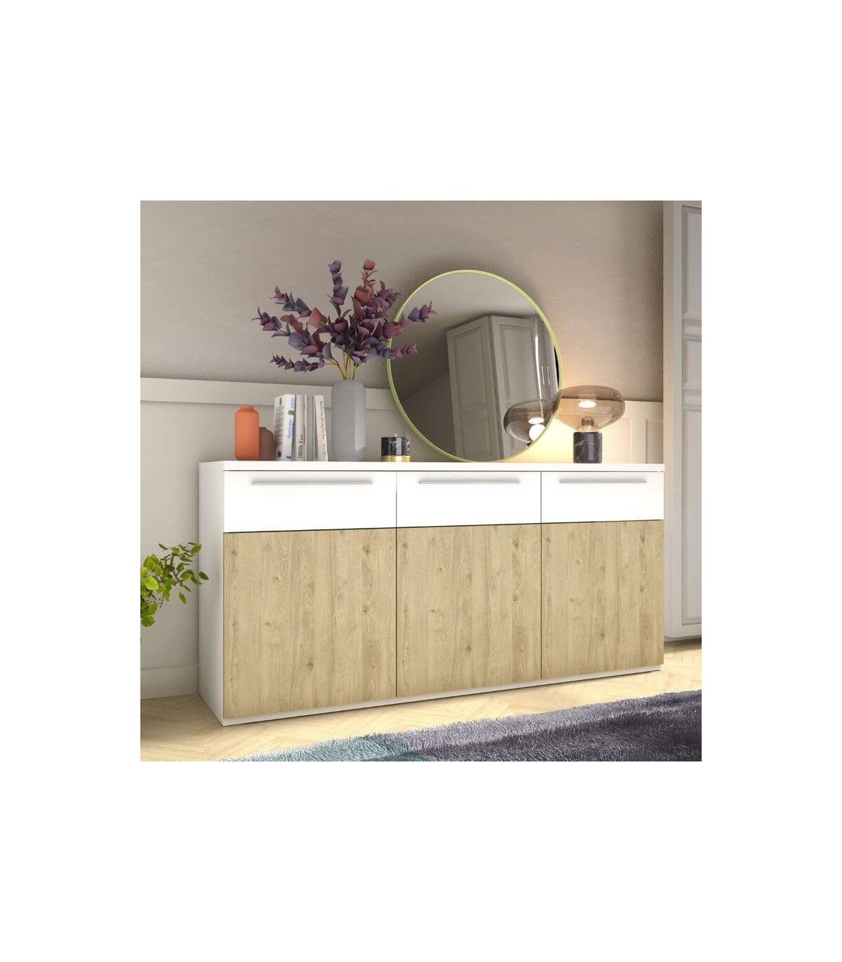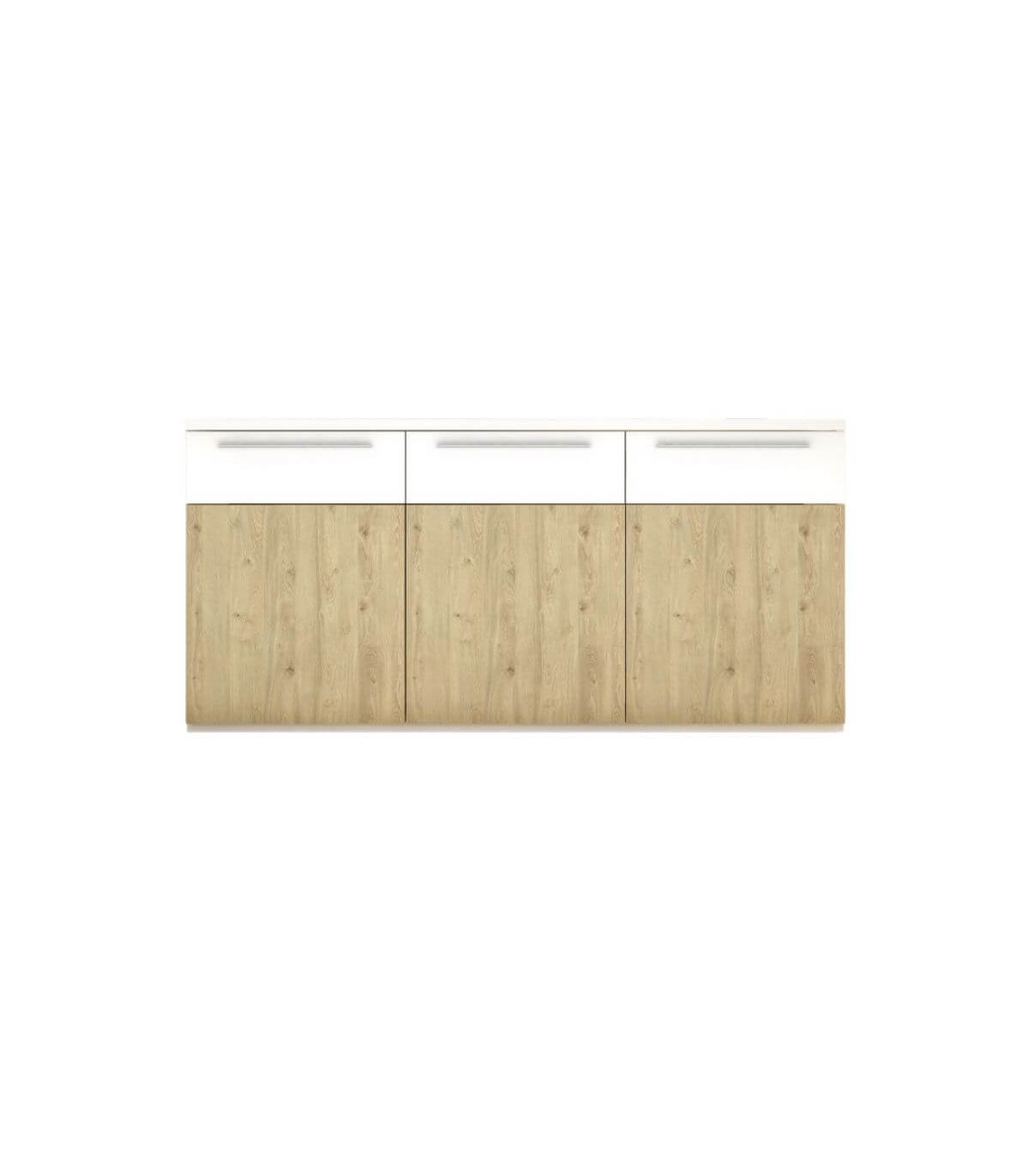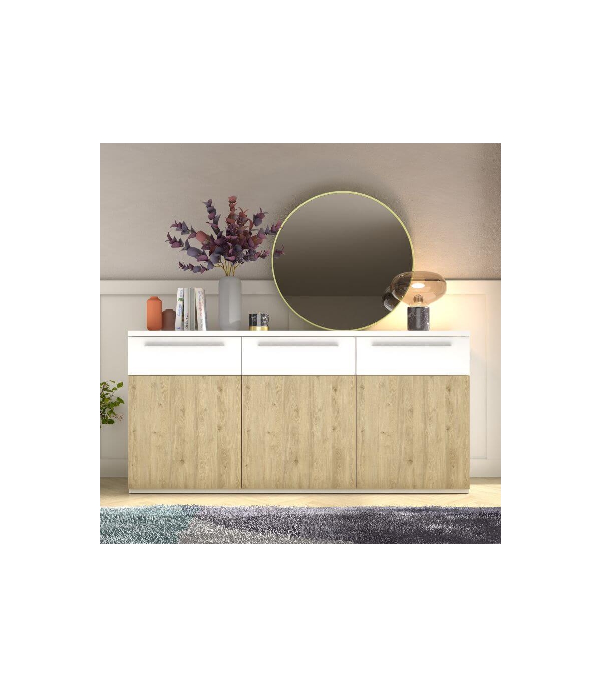 El aparador Isola es la pieza ideal para quienes buscan almacenaje funcional sin renunciar al diseño. Su elegante combinación en roble natural y blanco aporta luminosidad, calidez y un estilo contemporáneo que encaja perfectamente en salones y comedores modernos o nórdicos.