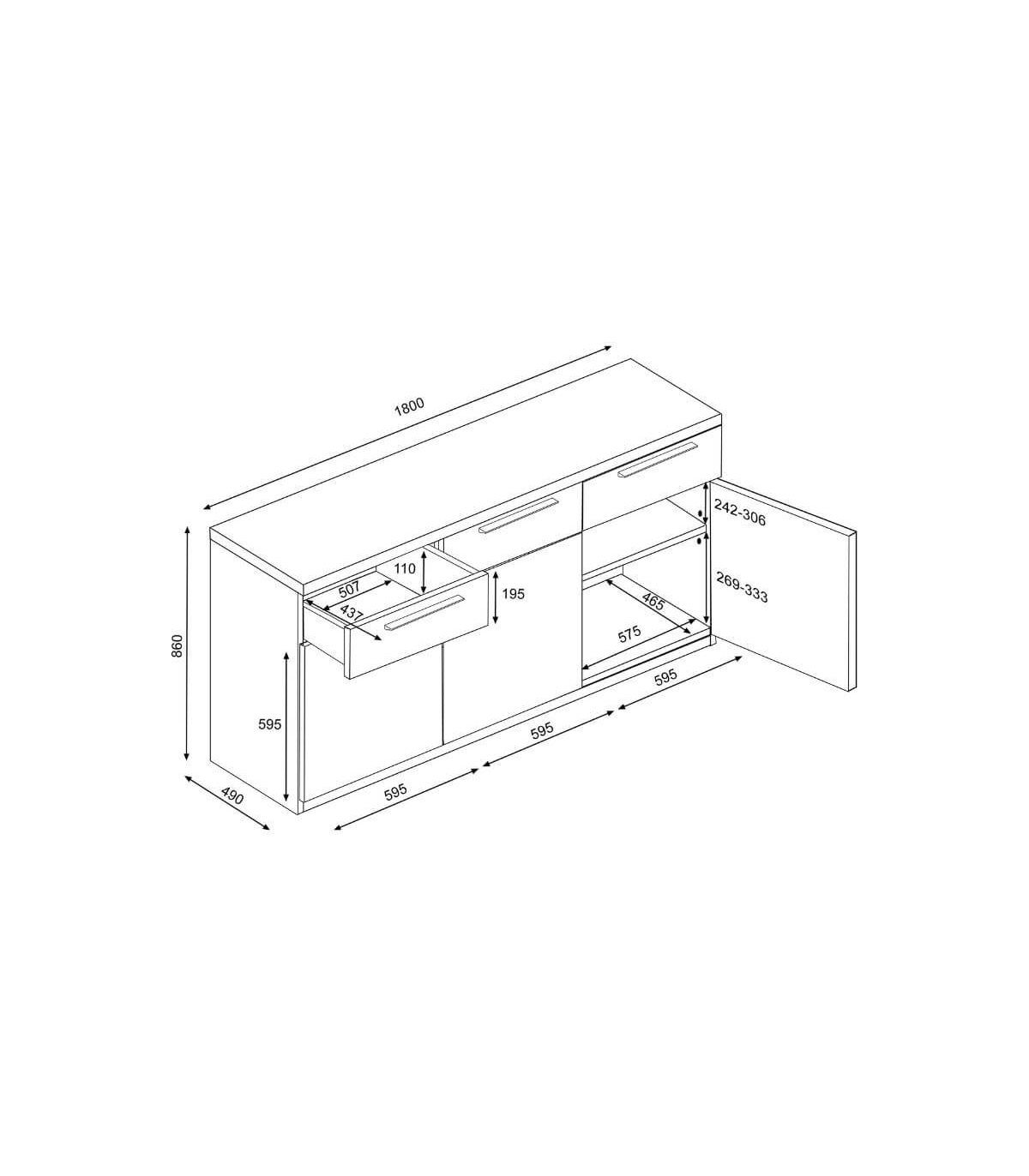Con unas medidas de 180 cm de ancho, 49 cm de fondo y 86 cm de alto, este aparador ofrece una gran capacidad sin resultar pesado visualmente, convirtiéndose en un mueble versátil y elegante.