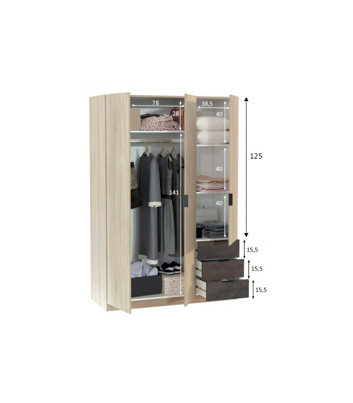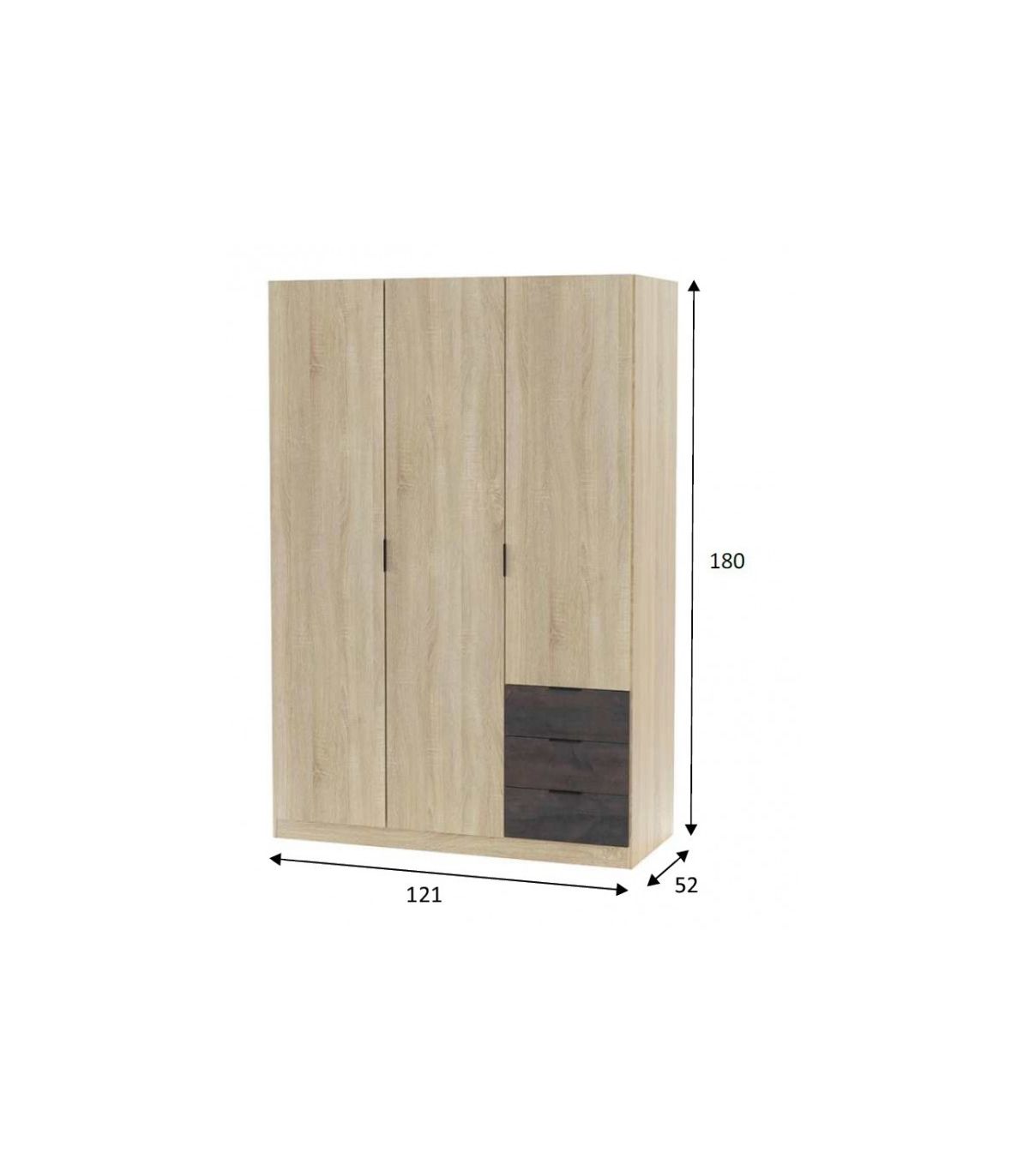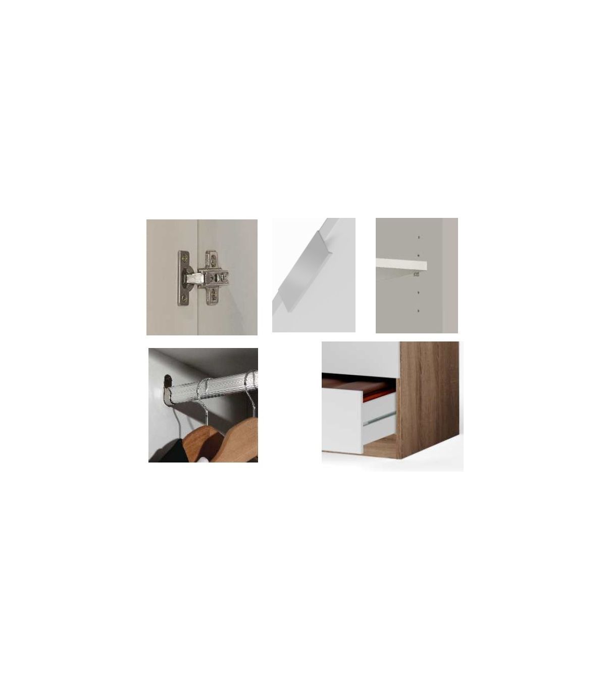 Sus dimensiones (180 cm de alto, 121 cm de ancho y 52 cm de fondo) ofrecen un amplio espacio interior, ideal para ropa, textiles o cualquier otro elemento que necesites guardar. Su interior está inteligentemente distribuido para maximizar la organización: incluye barra de colgar, estantes funcionales y tres cajones exteriores para objetos más pequeños.