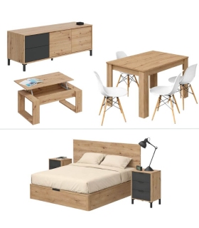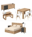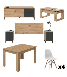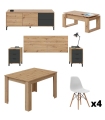 Conjunto Salón Julia Nodi compuesto por un mueble de Salón Julia, una mesa de comedor extensible Kendra, una mesa de centro Nova y un juego de cuatro sillas Tower. El mueble de salón está acabado en Roble Nodi y Blanco Artik, la mesa de centro y la mesa de comedor tienen un acabado en Roble Nodi y el acabado de las sillas es en Blanco.
