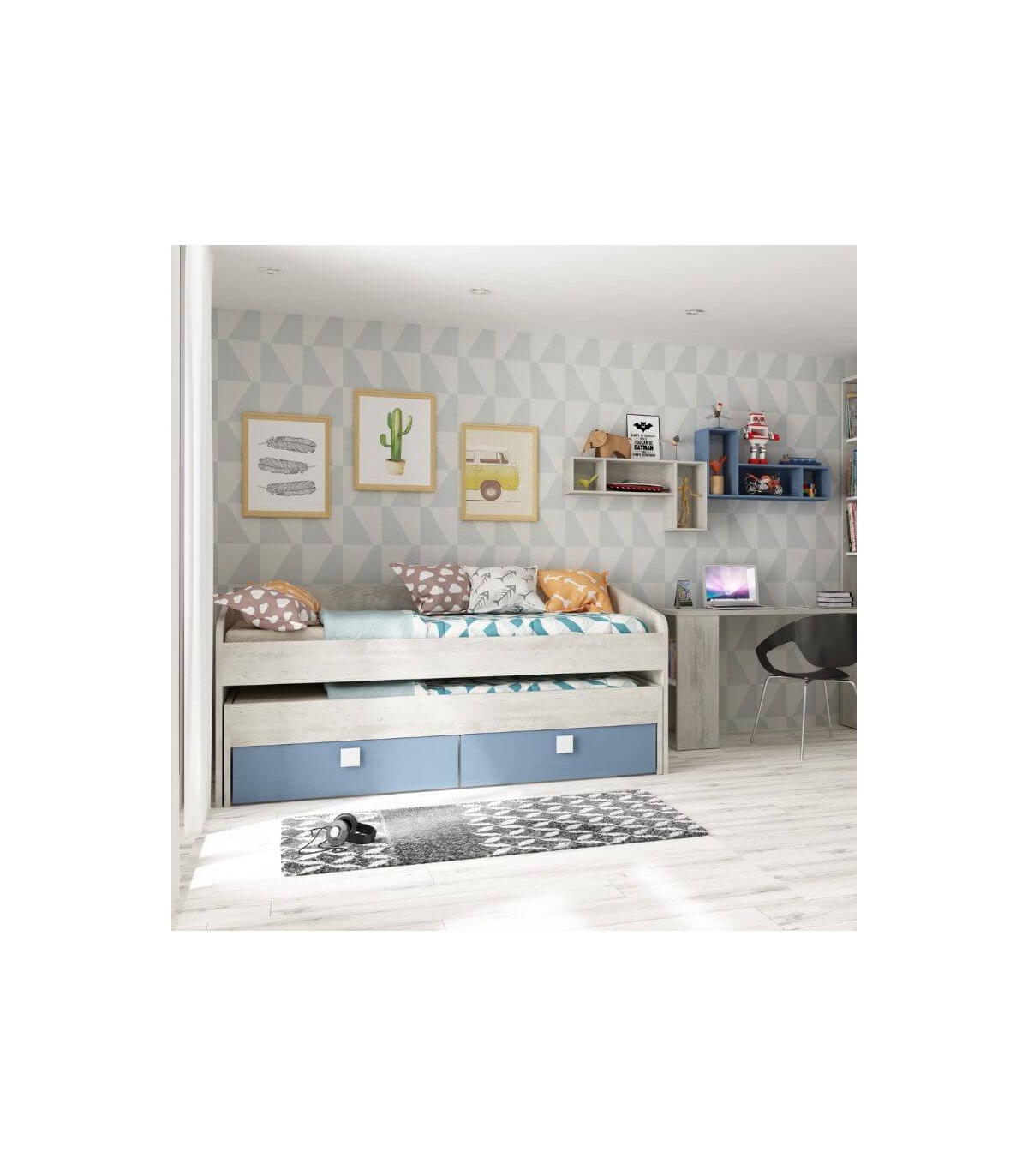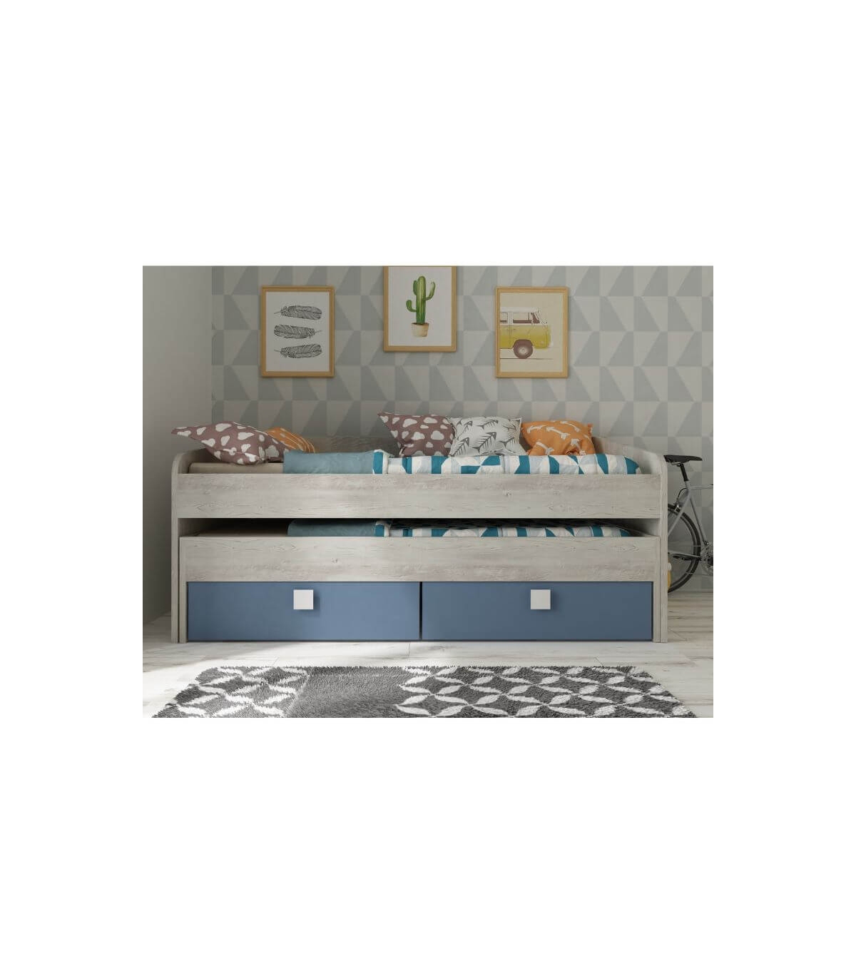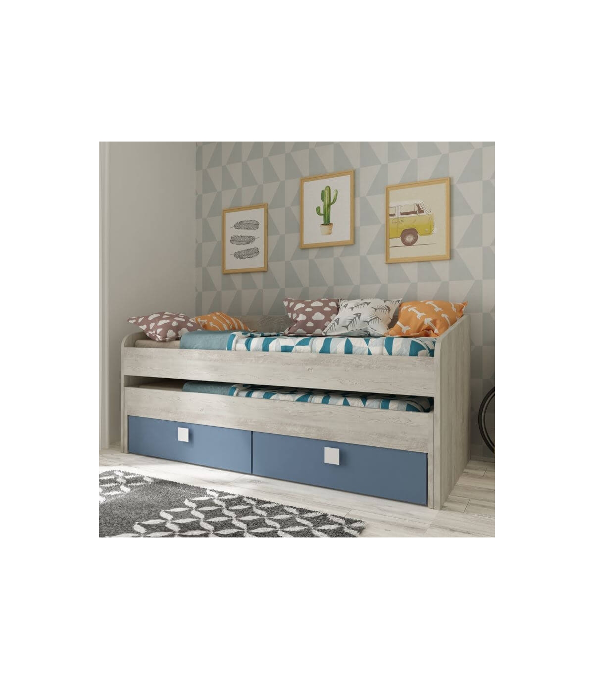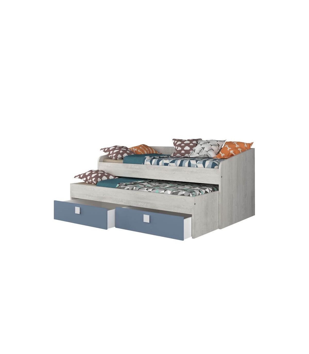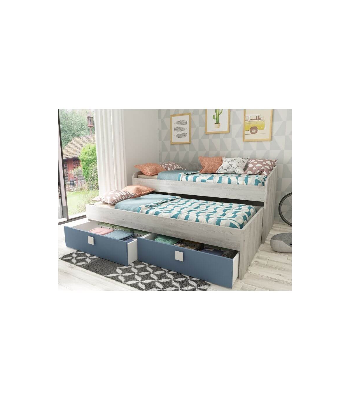 La Cama Nido Apolo es perfecta para dormitorios juveniles o infantiles donde el espacio es clave. Su diseño inteligente integra dos camas individuales de 90x190 cm junto con dos amplios cajones inferiores, ofreciendo una solución práctica, cómoda y ordenada en un solo mueble.