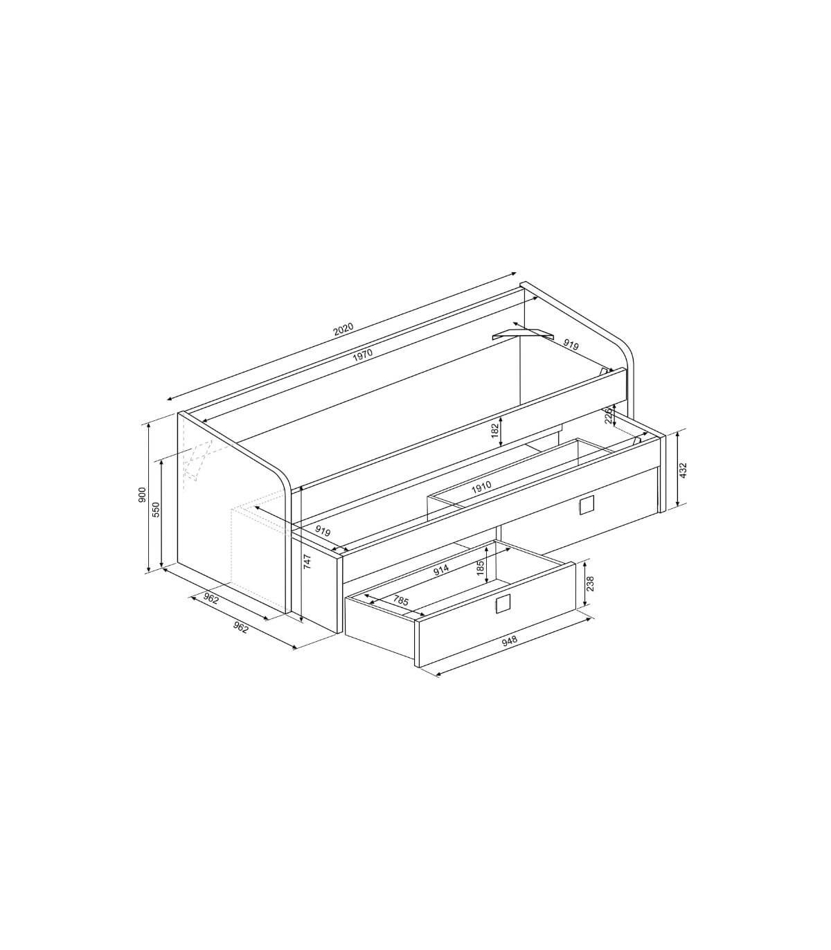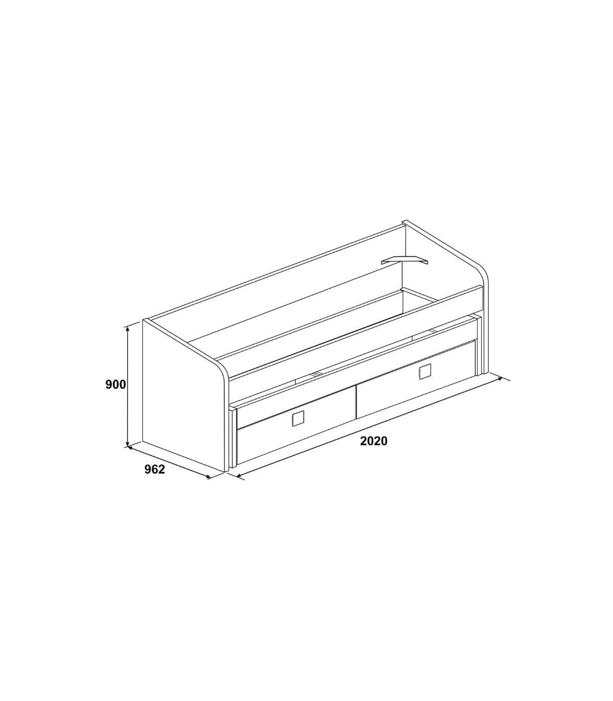Medidas Cama Nido cerrada: Ancho: 202 cm. x Fondo: 96 cm. x Alto: 90 cm.