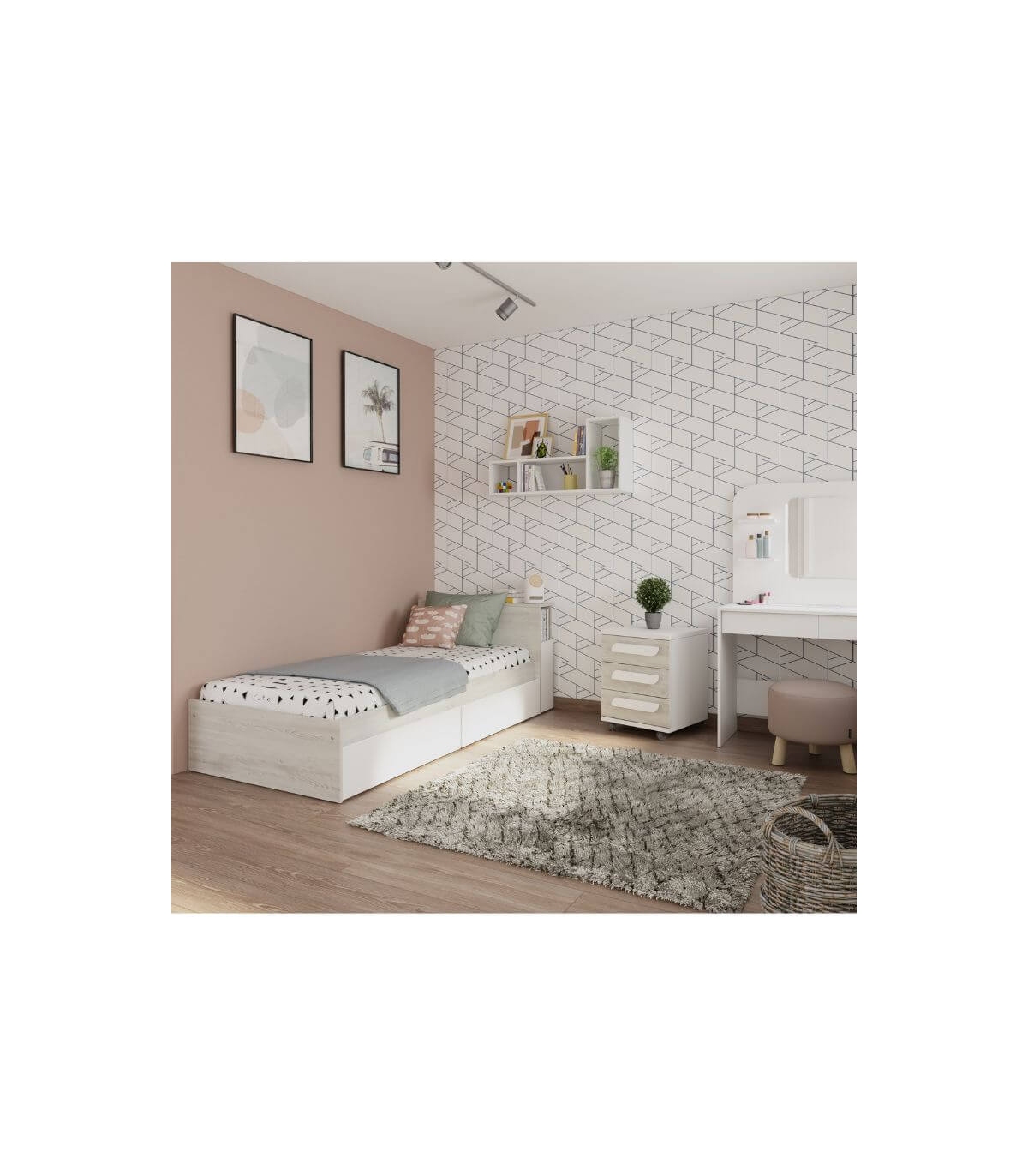 La cama con cajones y cabecero con mesita extraible Jazz es una solución práctica y moderna para dormitorios juveniles o infantiles que necesitan optimizar el espacio sin renunciar al diseño. Su acabado en Cascina y blanco aporta luminosidad y un estilo actual que encaja fácilmente en ambientes nórdicos o contemporáneos.