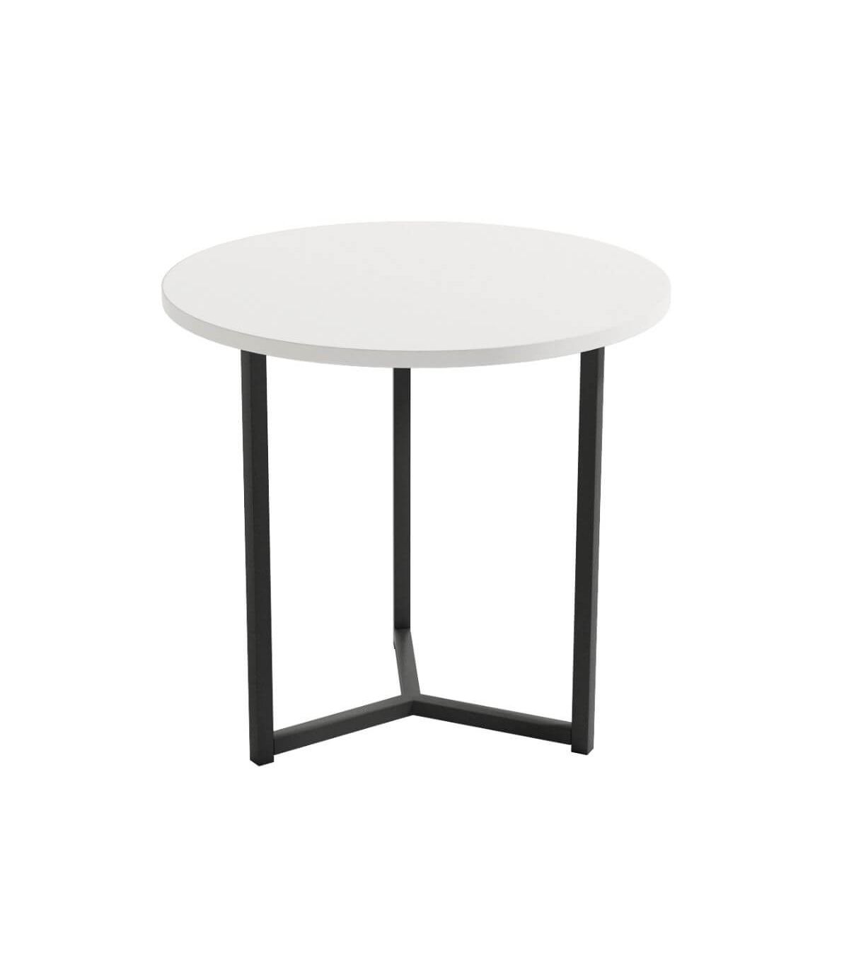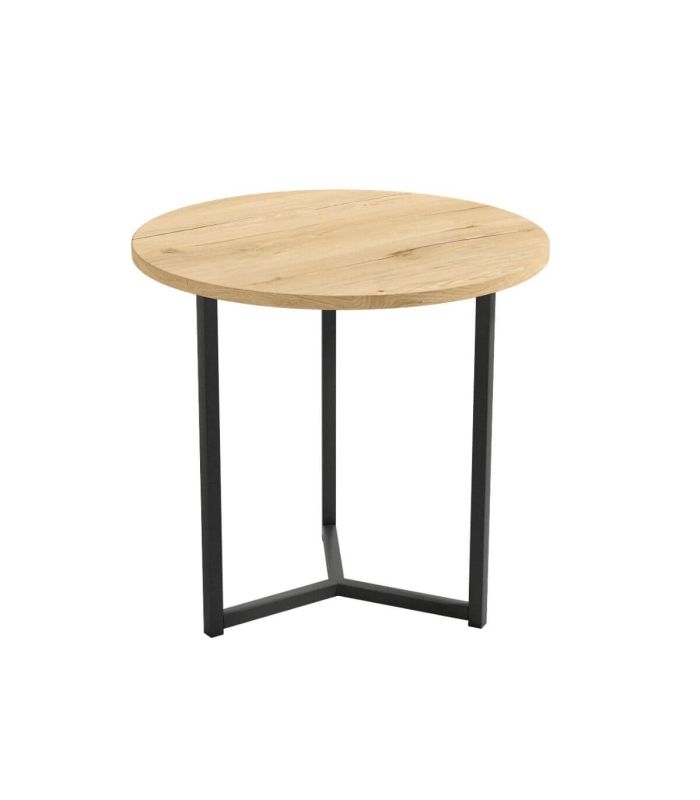 Su estructura de metal en color negro garantiza estabilidad y presencia, mientras que su sobre de 50 cm de diámetro y 15 mm de espesor ofrece el espacio justo para tener a mano lo esencial: el mando, una revista, tu móvil o una taza de café.