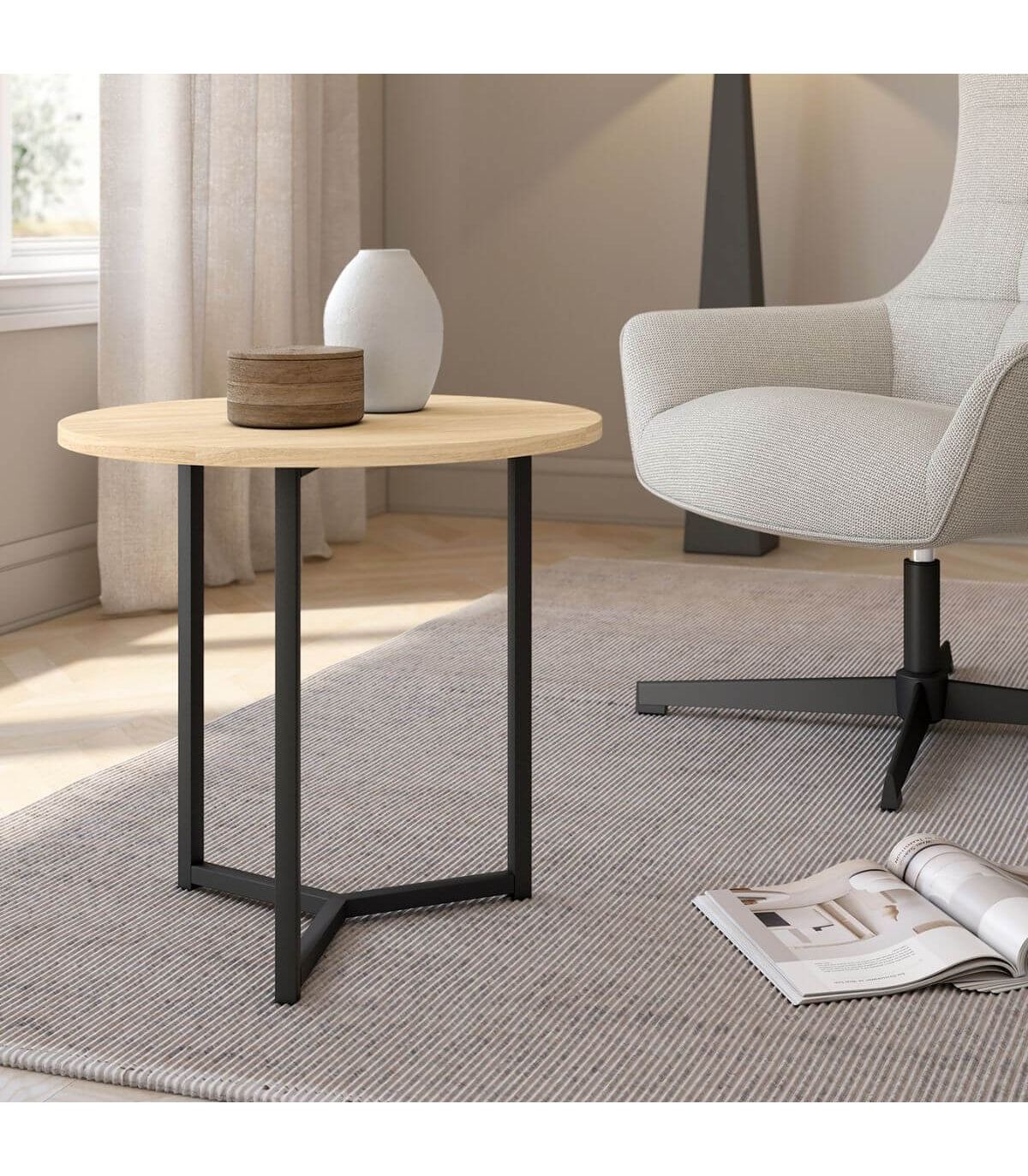 La mesa auxiliar Pacífico destaca por su diseño elegante y compacto de 50 cm, perfecta para tener todo a mano junto al sofá. Con estructura metálica negra y sobre disponible en 6 acabados modernos.