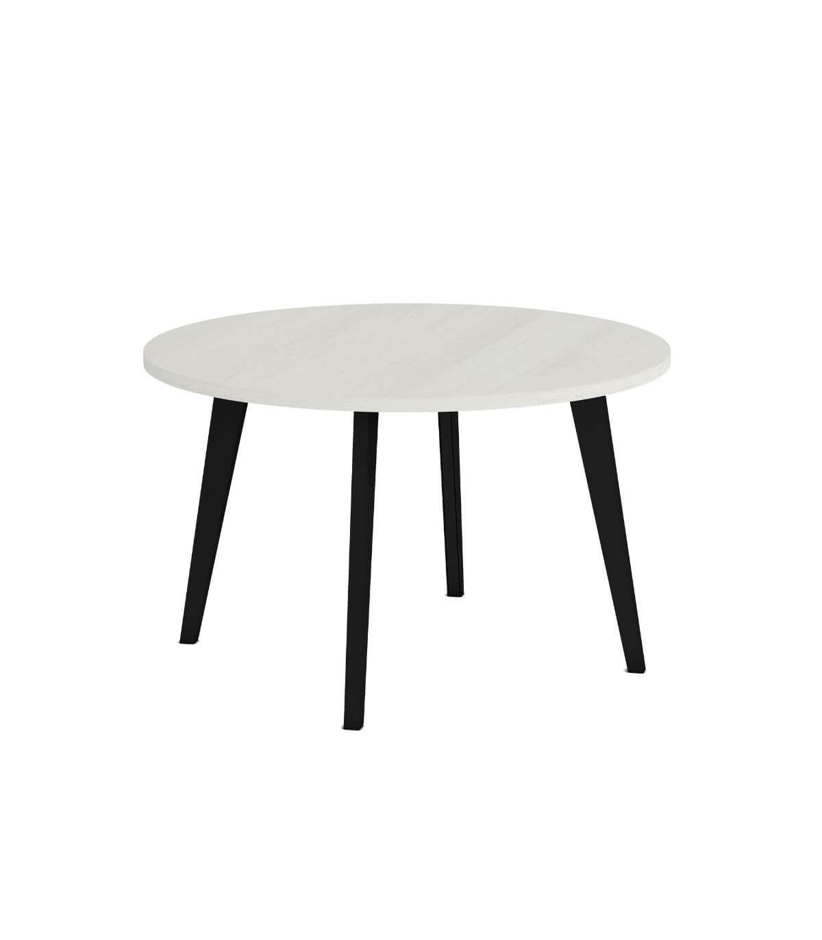 Esta mesa redonda fija de 110 cm está disponible en color Roble Natural, Artisán, Albián y Polar con patas metálicas en color Blanco y Negro.