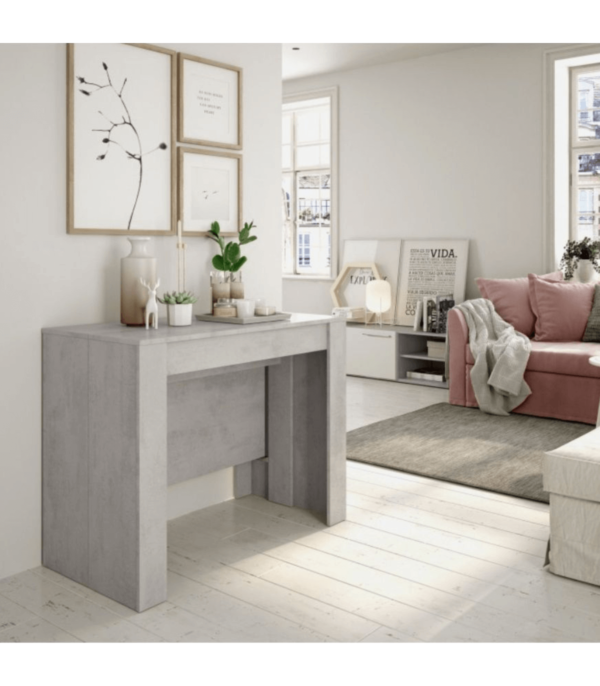 Te presentamos una de las mesas más sorprendentes de nuestro catálogo: la mesa consola extensible en color cemento. Elegante, compacta y extremadamente funcional, este modelo se adapta a tu espacio y tus necesidades en cuestión de segundos.