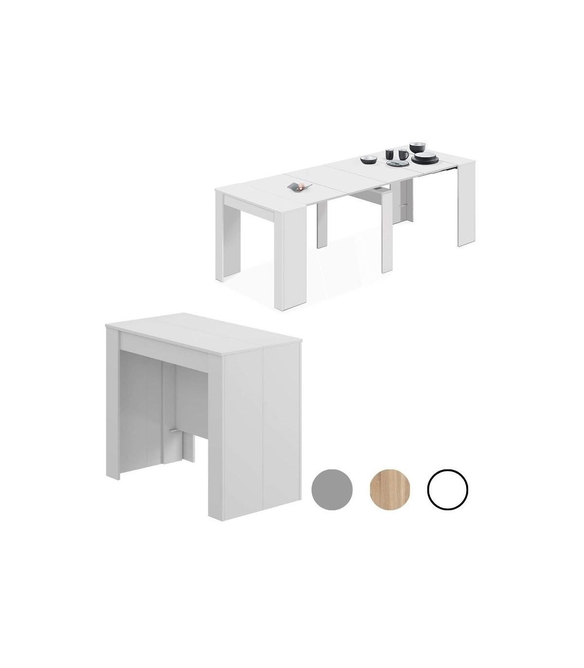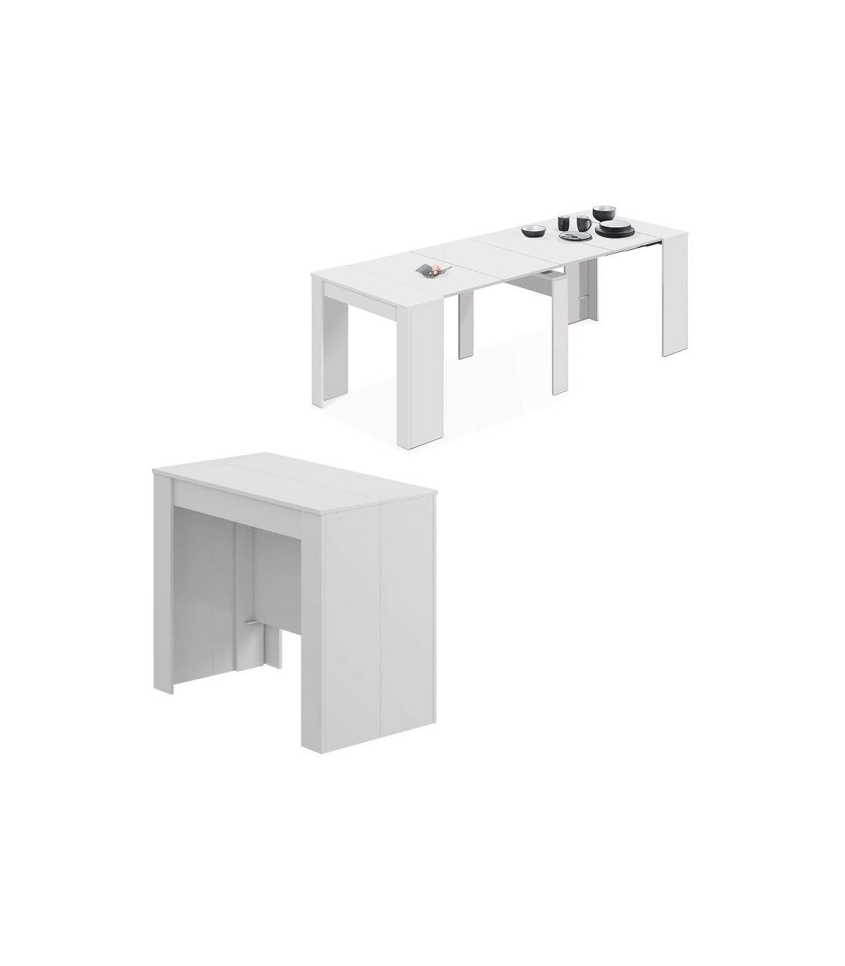 Mesa consola extensible blanca con 5 posiciones, de 51 a 237 cm. Compacta, moderna y funcional, se transforma en mesa de comedor para hasta 10 comensales. La solución versátil perfecta para hogares prácticos.