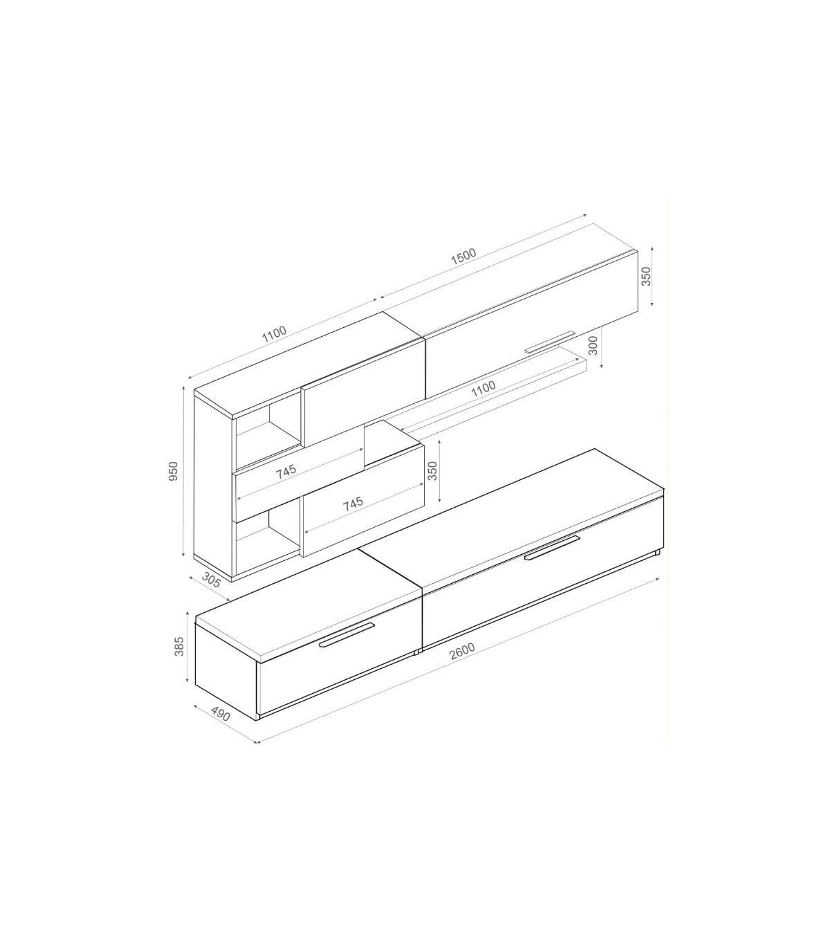 Módulo inferior: Ancho: 260 cm x Fondo: 49 cm x Alto: 38.5 cm