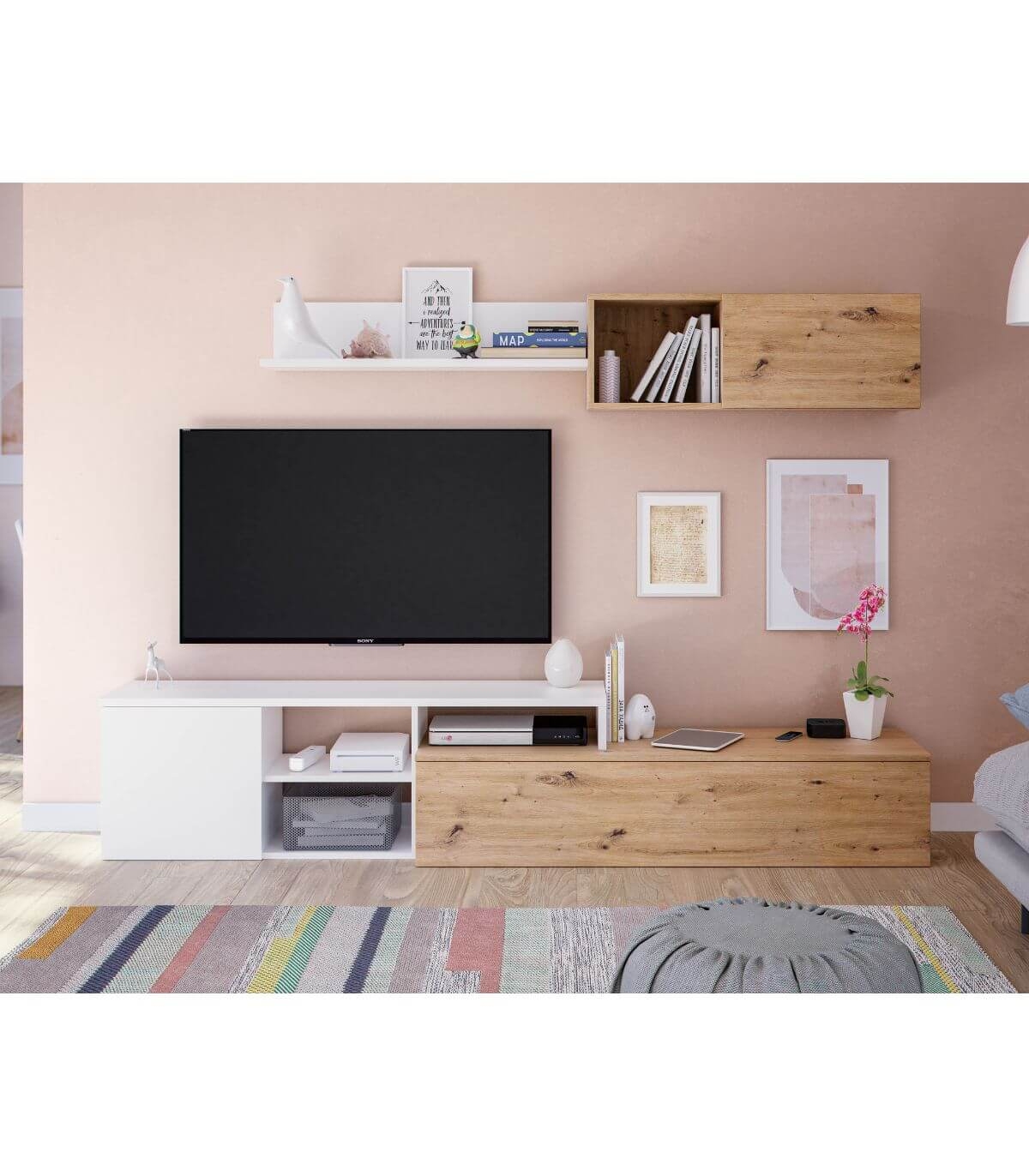 Su principal ventaja es la versatilidad: el conjunto es reversible, lo que permite colocar el módulo de TV, el módulo superior y la estantería tanto a la izquierda como a la derecha, adaptándose a la distribución de cada espacio.