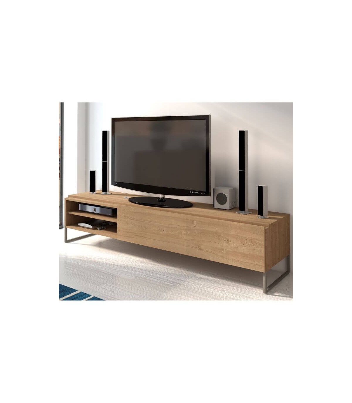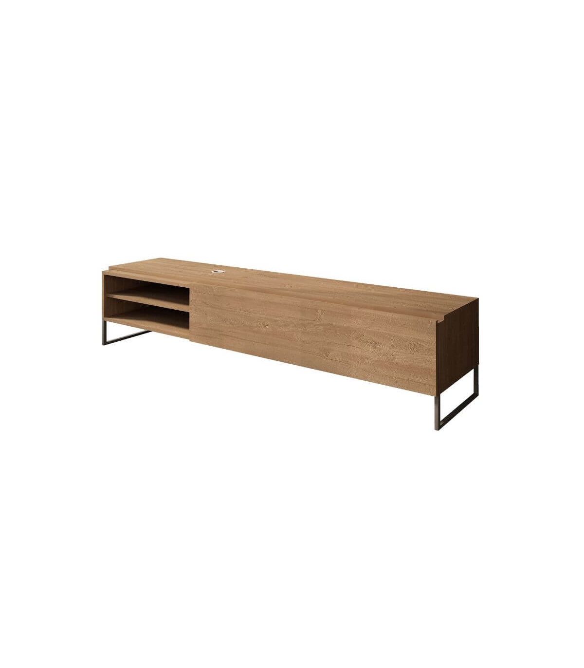 Diseñado para ofrecer gran capacidad de almacenaje, incorpora una puerta abatible y un espacio con estante, perfecto para organizar dispositivos electrónicos, mandos o accesorios multimedia. Su sistema de apertura sin tiradores refuerza una estética limpia y minimalista.
