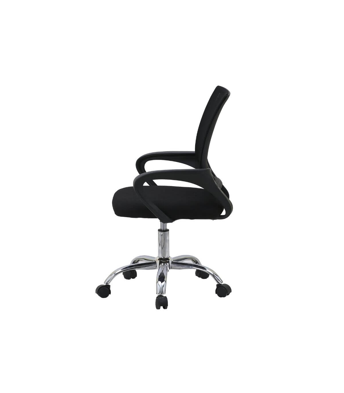 El asiento acolchado tapizado en tela garantiza una sentada confortable, mientras que sus reposabrazos fijos de diseño curvo ofrecen un apoyo estable y ergonómico. Su base metálica cromada con 5 ruedas multidireccionales permite moverte con total libertad y fluidez.
