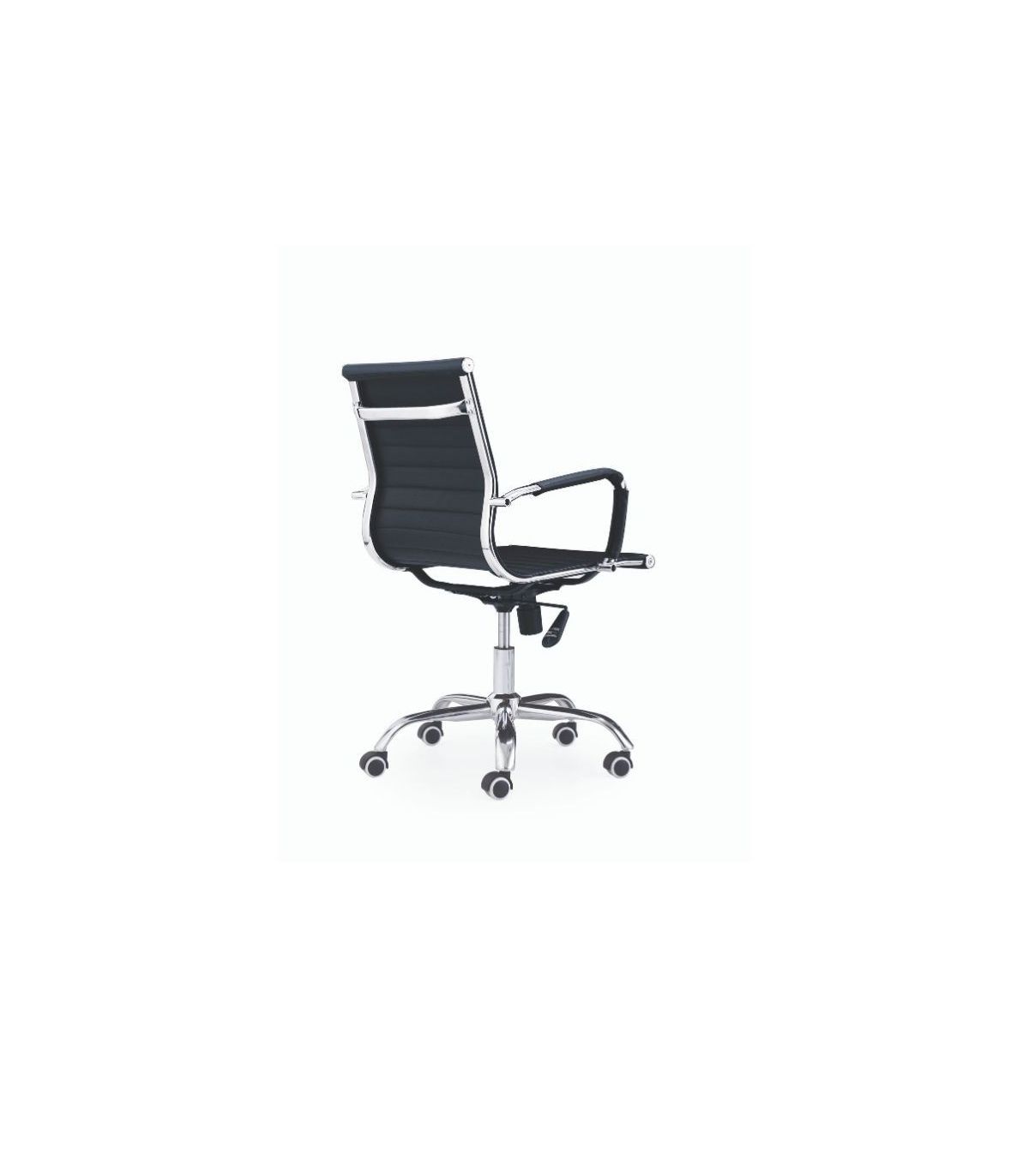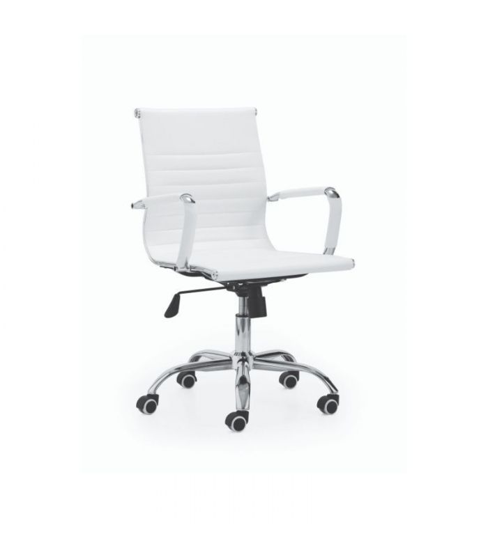 Fabricado en estructura metálica cromada y tapizado Polipiel PU, además del sistema de balanceo sincronizado cuenta con brazos fijos con protección desenfundable y ruedas aptas para parqué.